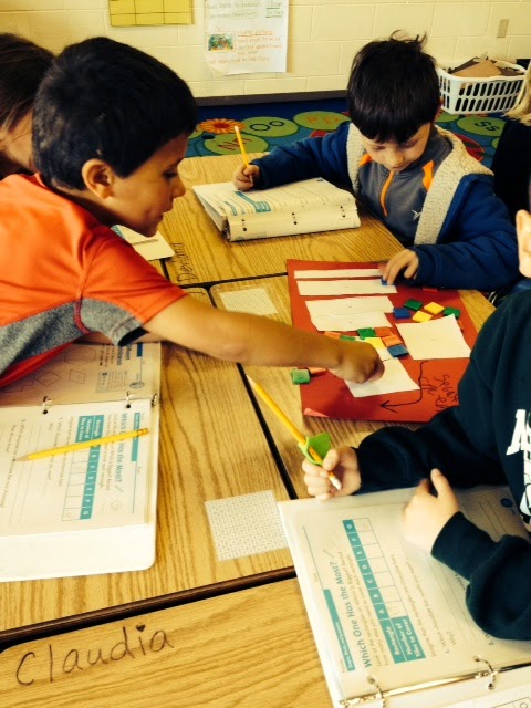 During our study of Geoblocks students are investigating rectangles and finding the biggest in different ways. They are using this and ordering shapes A-G from biggest to smallest using an assortment of different shapes and sizes of rectangles. It was trickier that they thought! Students also used what they ordered to cover with square tiles finding how many tiles covered the different rectangles. This identified which rectangle was the biggest and smallest. We also threw in predicting to see how close they were to mentally figuring it out. As you see they had fun with it :)